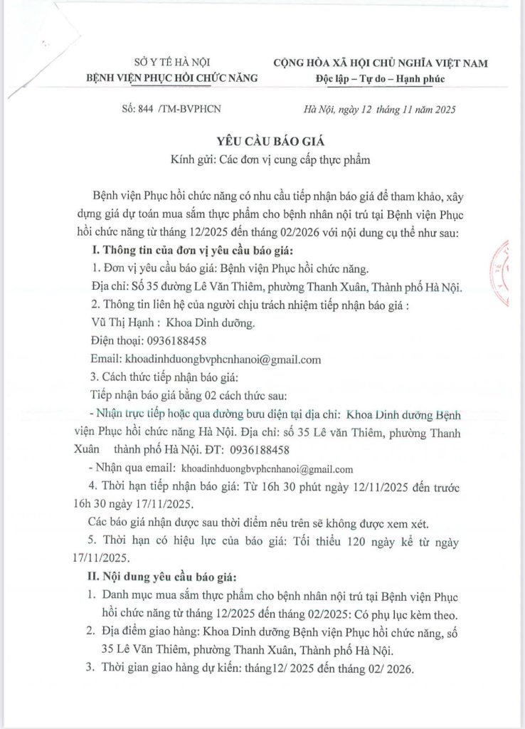 Trang chủ » Tin tức » Thông tin mua sắm - đầu tư » YÊU CẦU BÁO GIÁ CÁC ĐƠN VỊ CUNG CẤP THỰC PHẨM YÊU CẦU BÁO GIÁ CÁC ĐƠN VỊ CUNG CẤP THỰC PHẨM Đăng vào ngày 12/11/2025 lúc: 16:43 174 lượt xem Chi tiết báo giá: 12112025192515 Có thể bạn quan tâm: Co thắt tâm vị: Nguyên nhân, triệu chứng và cách phòng bệnh (03/09/2025) THƯ MỜI YÊU CẦU BÁO GIÁ GÓI THẦU DỰ TOÁN MUA SẮM MÁY TÍNH ĐỂ BÀN, MÁY IN NĂM 2024 (01/08/2024) Lịch tuần từ 17/02 từ 23/02/2025 (18/02/2025) THƯ MỜI CHÀO GIÁ DỊCH VỤ TƯ VẤN THẨM ĐỊNH E-HSMT, THẨM ĐỊNH KẾT QUẢ LỰA CHỌN NHÀ THẦU CHO VIỆC MUA SẮM VĂN PHÒNG PHẨM THUỘC DỰ TOÁN MUA SẮM VĂN PHÒNG PHẨM NĂM 2024 (31/07/2024) QUYẾT ĐỊNH VỀ VIỆC BAN HÀNH NỘI QUY, QUY CHẾ XÉT TUYỂN VIÊN CHỨC VÀO LÀM VIỆC TẠI BỆNH VIỆN PHỤC HỒI CHỨC NĂNG NĂM 2023 (20/03/2024) Lịch tuần từ 02/12 đến 08/12/2024 (02/12/2024) KẾ HOẠCH PHÒNG, CHỐNG DỊCH THƯỜNG XUYÊN NĂM 2025 (07/02/2025) Dịch vụ nội trú (25/09/2023) LỄ KẾT NẠP ĐẢNG VIÊN MỚI (03/10/2024) THÔNG BÁO: Về việc nghỉ lễ Quốc khánh 2/9/2025 (28/08/2025) Thư mời: Gói thầu Tổ chức nghỉ dưỡng cho viên chức, người lao động Bệnh viện Phục hồi chức năng năm 2025 (06/06/2025) BỆNH VIỆN PHỤC HỒI CHỨC NĂNG THAM GIA HỘI KHỎE CÁN BỘ, CCNVLĐ NGÀNH Y TẾ HÀ NỘI NĂM 2024 (07/10/2024) THƯ MỜI QUAN TÂM Dịch vụ Sửa chữa máy photocopy (17/11/2025) YÊU CẦU BÁO GIÁ GÓI THẦU MUA SẮM HÓA CHẤT NGOẠI KIỂM CHẤT LƯỢNG XÉT NGHIÊM HUYẾT HỌC, SINH HÓA, NƯỚC TIỂU NĂM 2024-2025 (23/09/2024) YÊU CẦU BÁO GIÁ (26/03/2024)