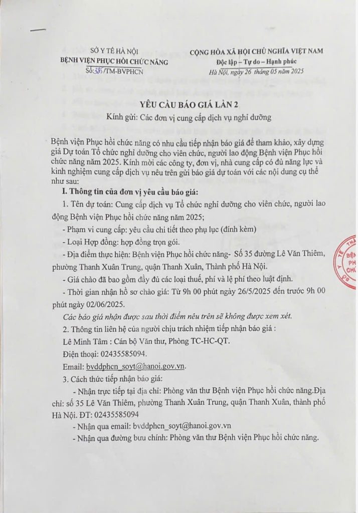 Yêu cầu báo giá: Cung cấp dịch vụ Tổ chức nghỉ dưỡng cho viên chức, người lao động Bệnh viện Phục hồi chức năng năm 2025