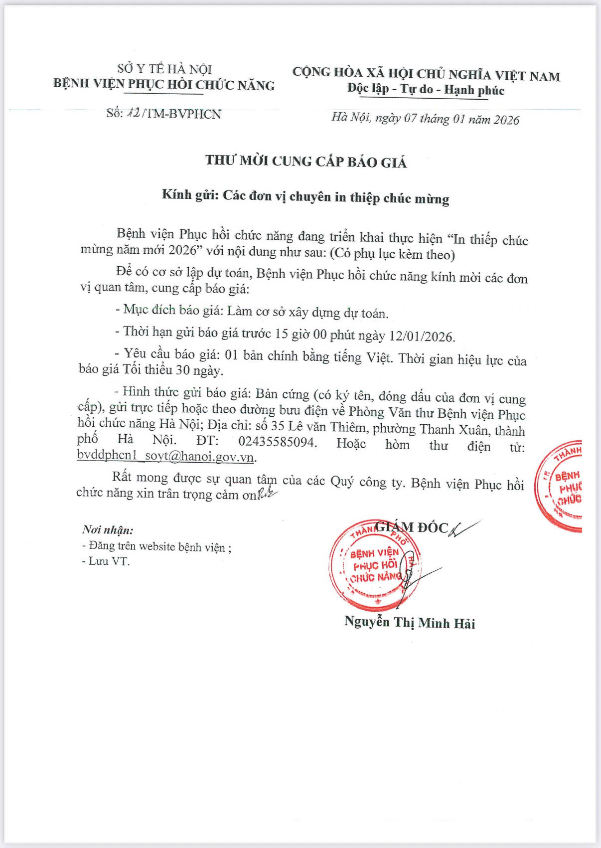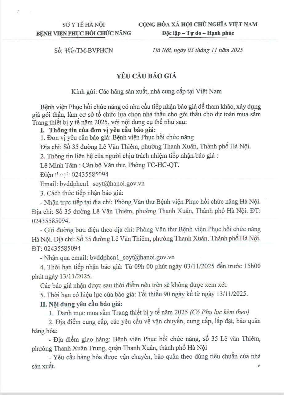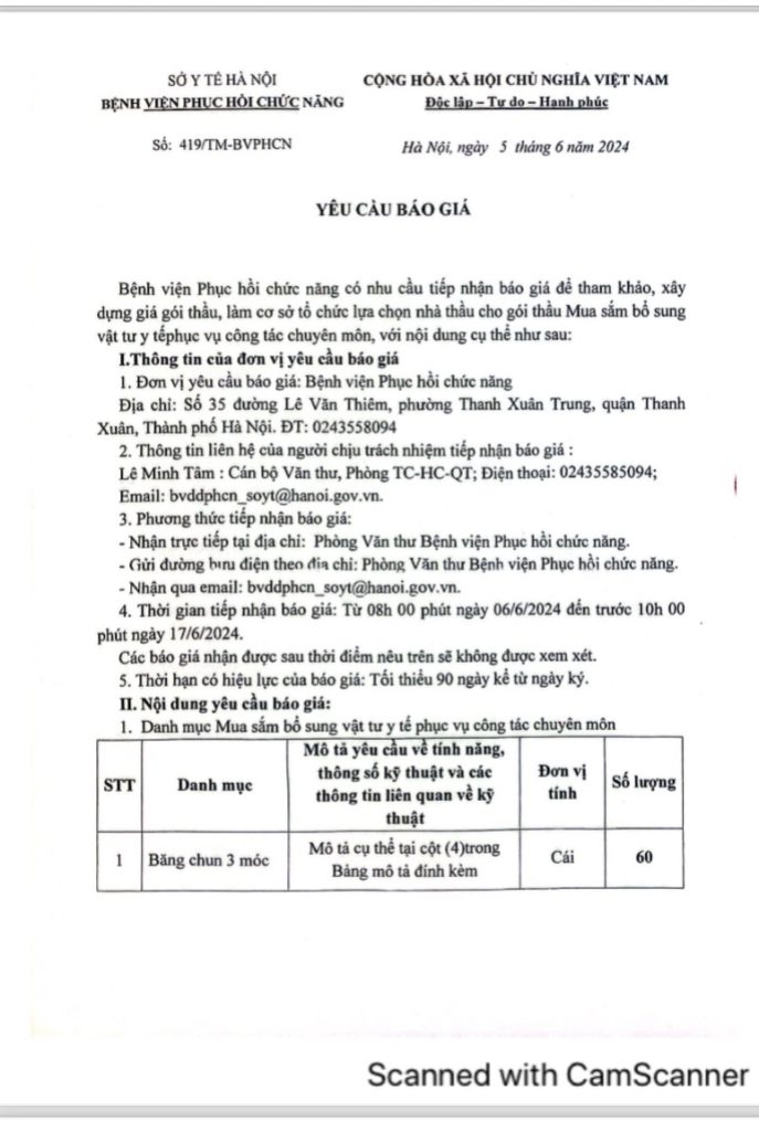 Bệnh viện Phục hồi chức năng Hà Nội có nhu cầu tiếp nhận báo giá để tham khảo, xây dựng giá gói thầu, làm cơ sở tổ chức lựa chọn nhà thầu cho gói thầu Mua sắm bổ sung vật tư y tế phục vụ công tác chuyên môn, với nội dung cụ thể như sau: