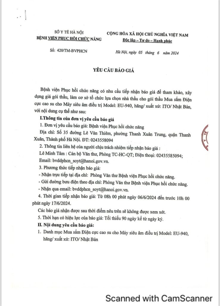 Bệnh viện Phục hồi chức năng có nhu cầu tiếp nhận báo giá để tham khảo, xây dựng giá gói thầu, làm cơ sở tổ chức lựa chọn nhà thầu cho gói thầu Mua sắm Điện cực cao su cho Máy siêu âm điều trị Model: EU-940. hãng/ xuất xứ: ITO/Nhật Bản với nội dung cụ thể như sau: