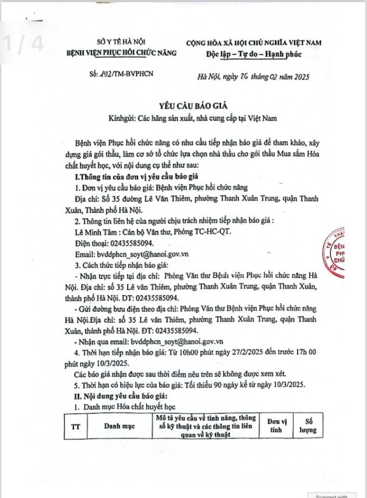 Bệnh viện Phục hồi chức năng có nhu cầu tiếp nhận báo giá để tham khảo, xây dựng giá gói thầu, làm cơ sở tổ chức lựa chọn nhà thầu cho gói thầu Mua sắm Hóa chất huyết học, với nội dung cụ thể như sau: