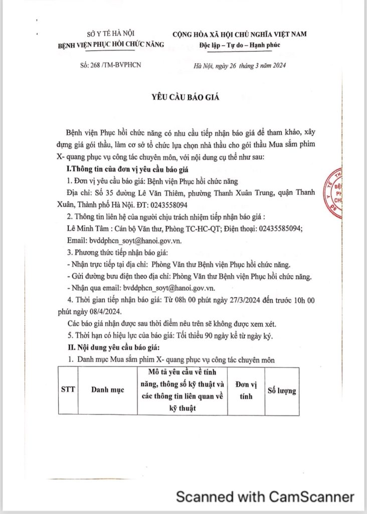 Bệnh viện Phục hồi chức năng có nhu cầu tiếp nhận báo giá để tham khảo, xây dựng giá gói thầu, làm cơ sở tổ chức lựa chọn nhà thầu cho gói thầu Mua sắm phim X-Quang phục vụ công tác chuyên môn.